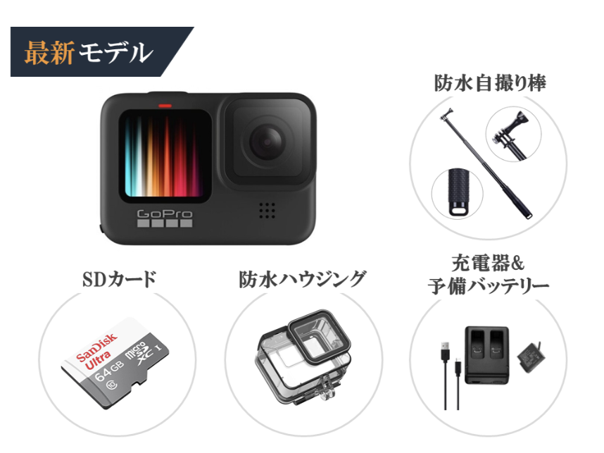 一式セットになったプランも用意されており、SDカード、防水ハウジング、防水自撮り棒、予備バッテリーと充電器が付属しています。